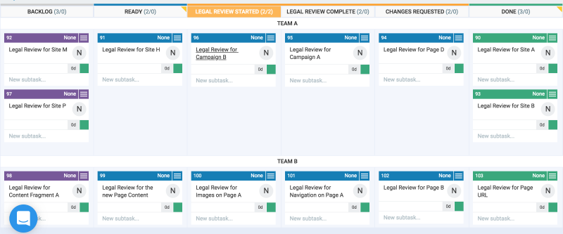 Another example is of an organization’s legal team that receives requests on a regular basis from different portfolios in the organization to review content on their sites, campaigns, offers, etc. from a legal point of view. Here’s a sample Kanban board for such a scenario.